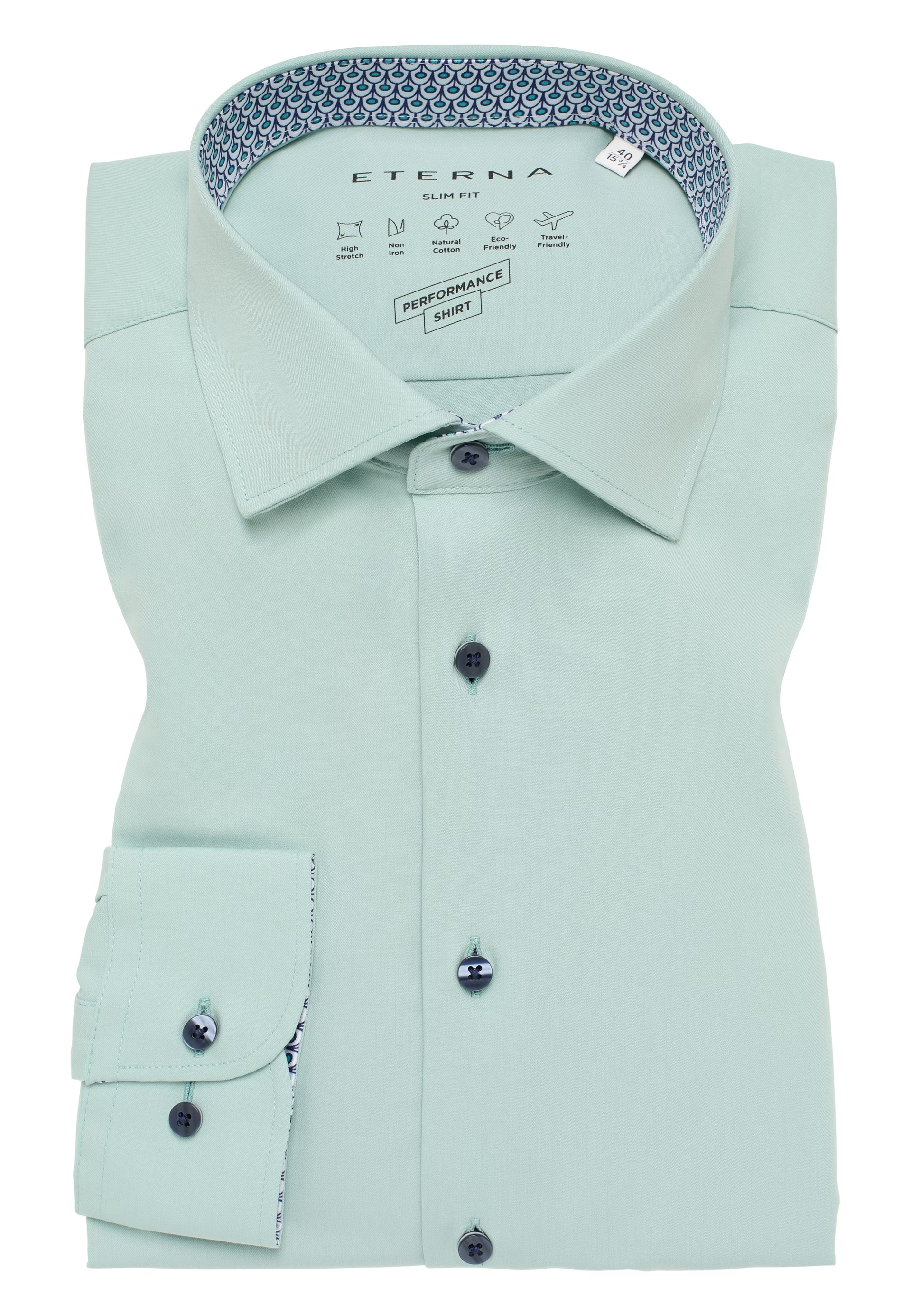 Vasalásmentes: Az Eterna ingek tartósan simák és puhák maradnak. Alacsony hőfokon és alacsony fordulatszámú centrifuga használata esetén a vasalás könnyített.